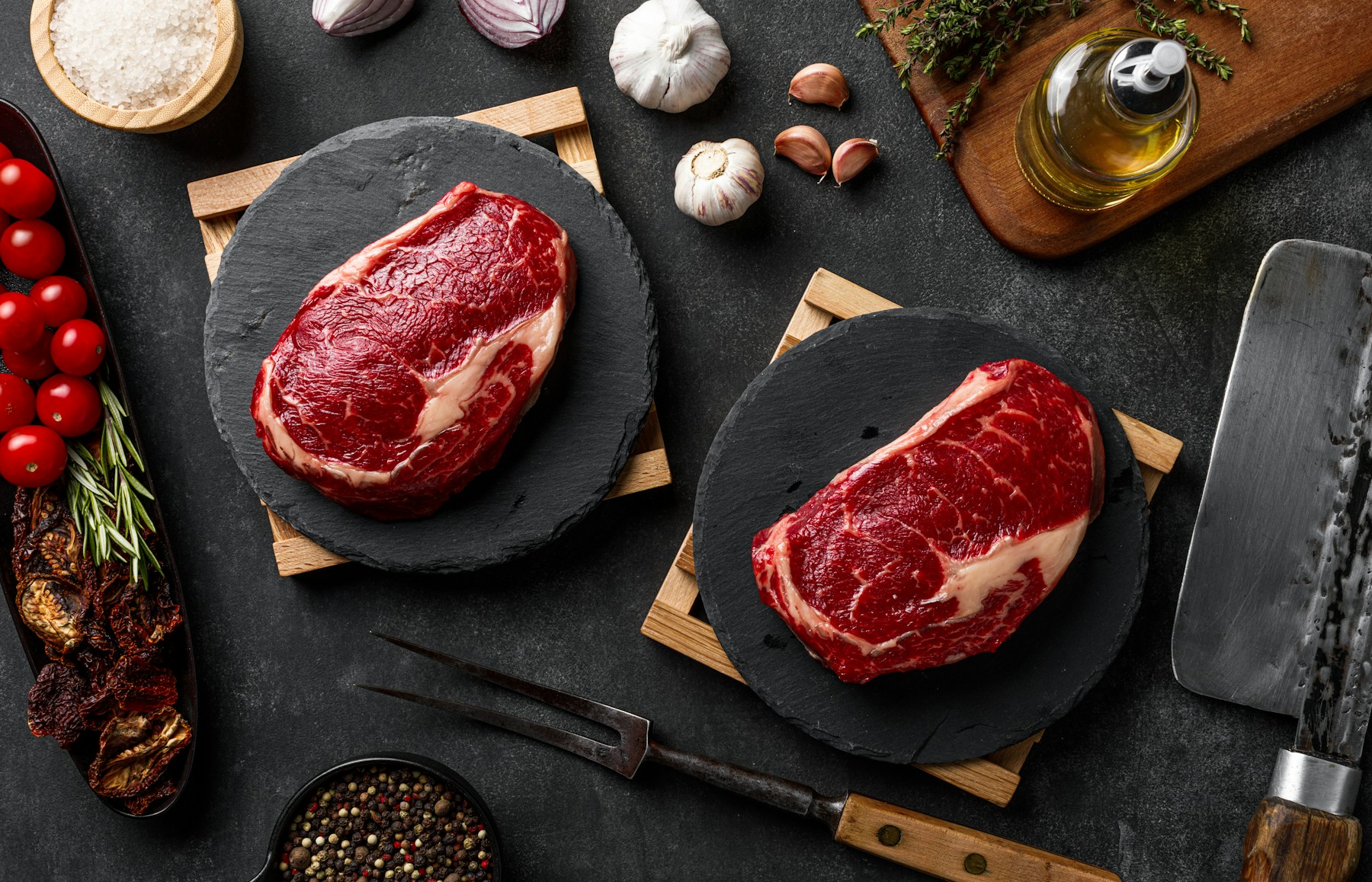 - Search content: a couple of steaks sitting on top of a cutting board. Raw ribeye steak cooking. Fresh meat on graphite cutting board. meat, beef, food