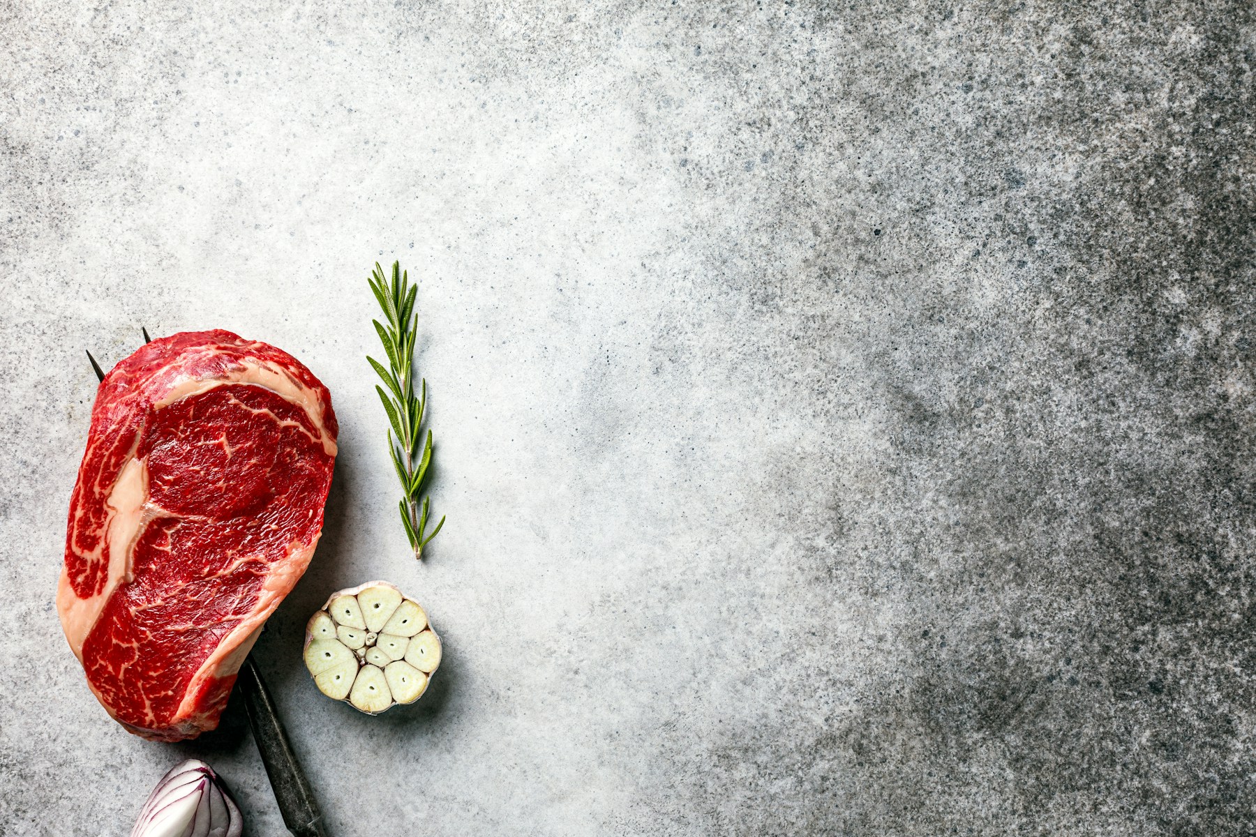 - Description: Raw ribeye steak cooking. Fresh meat on graphite cutting board